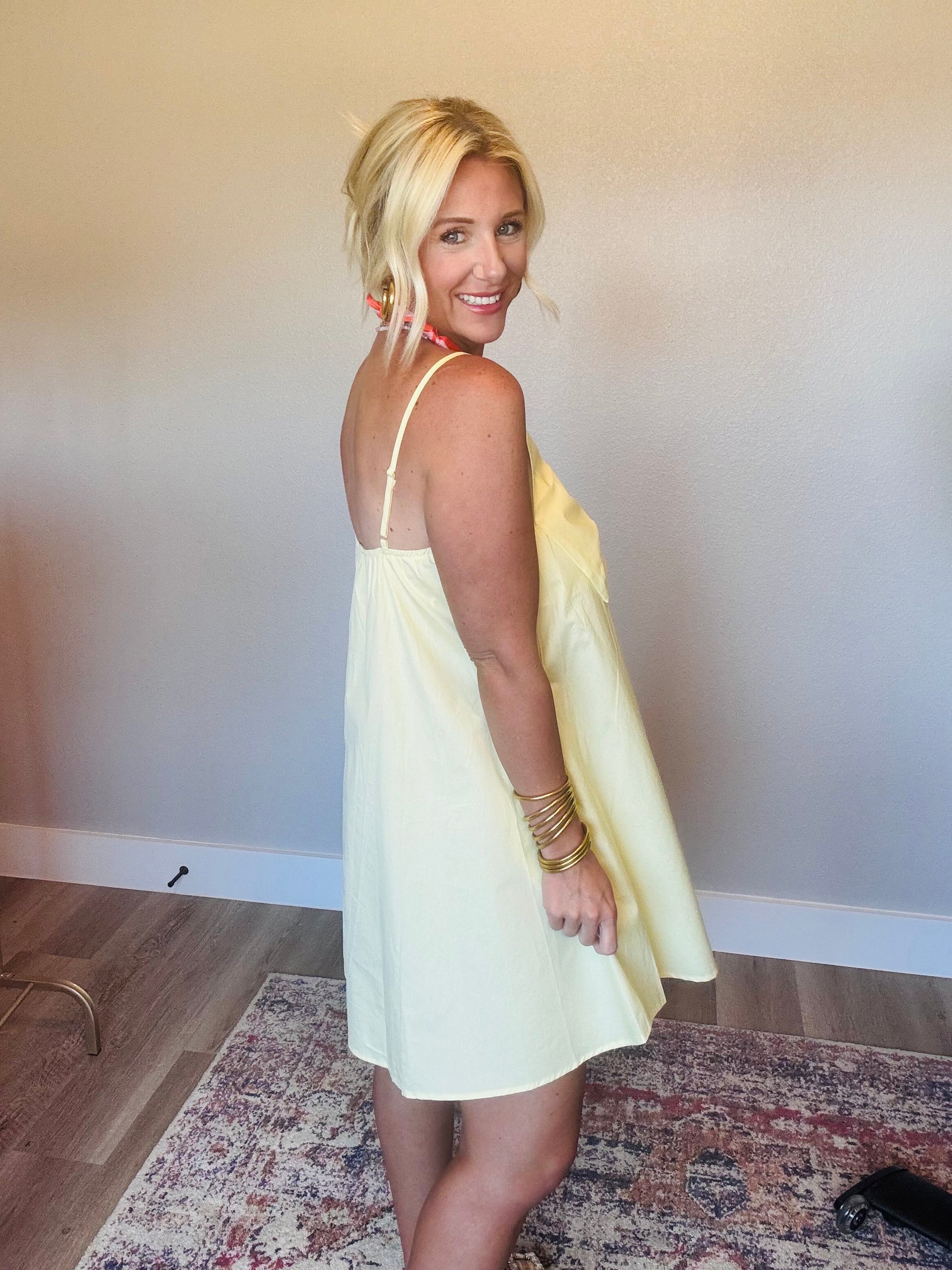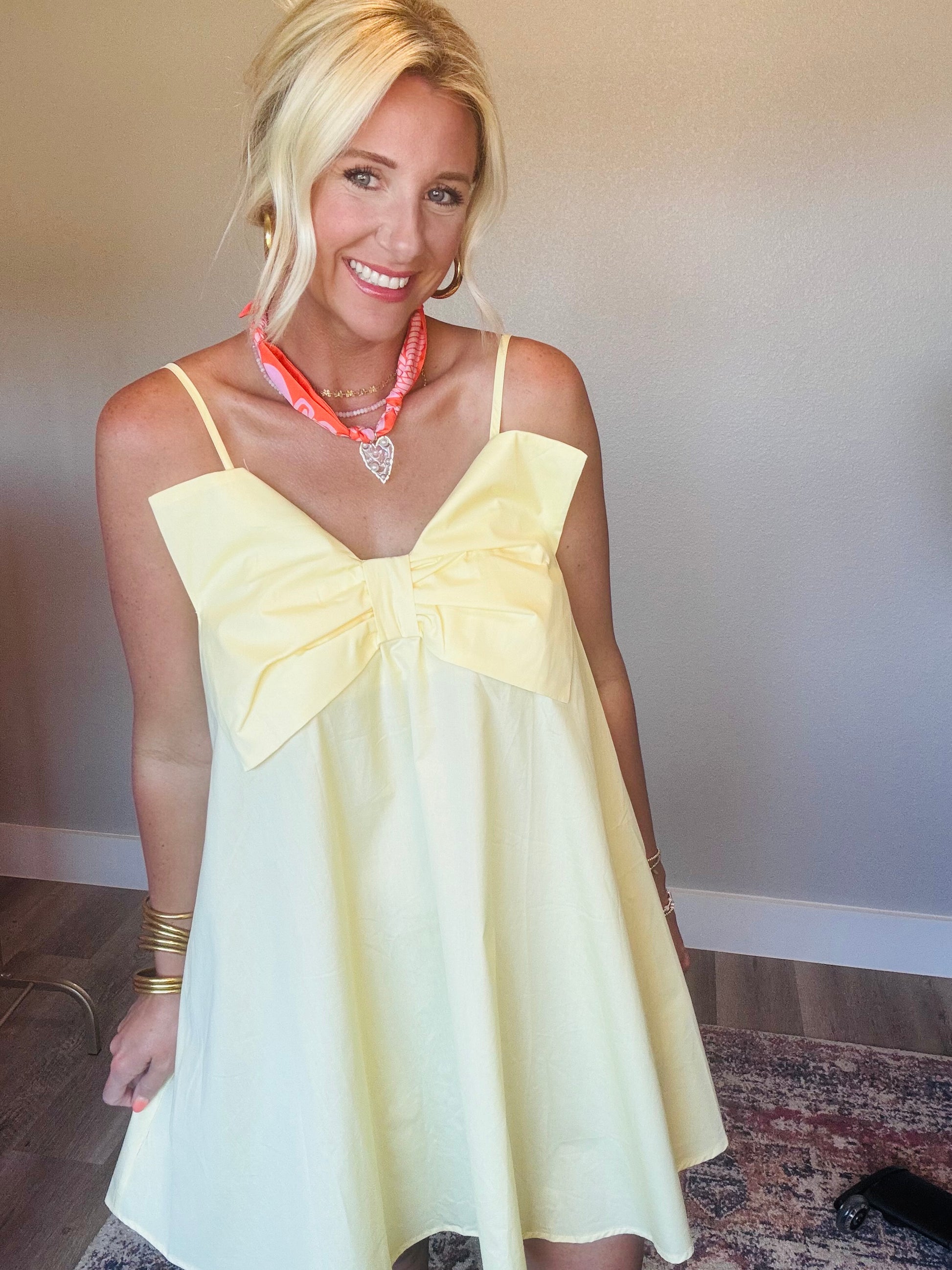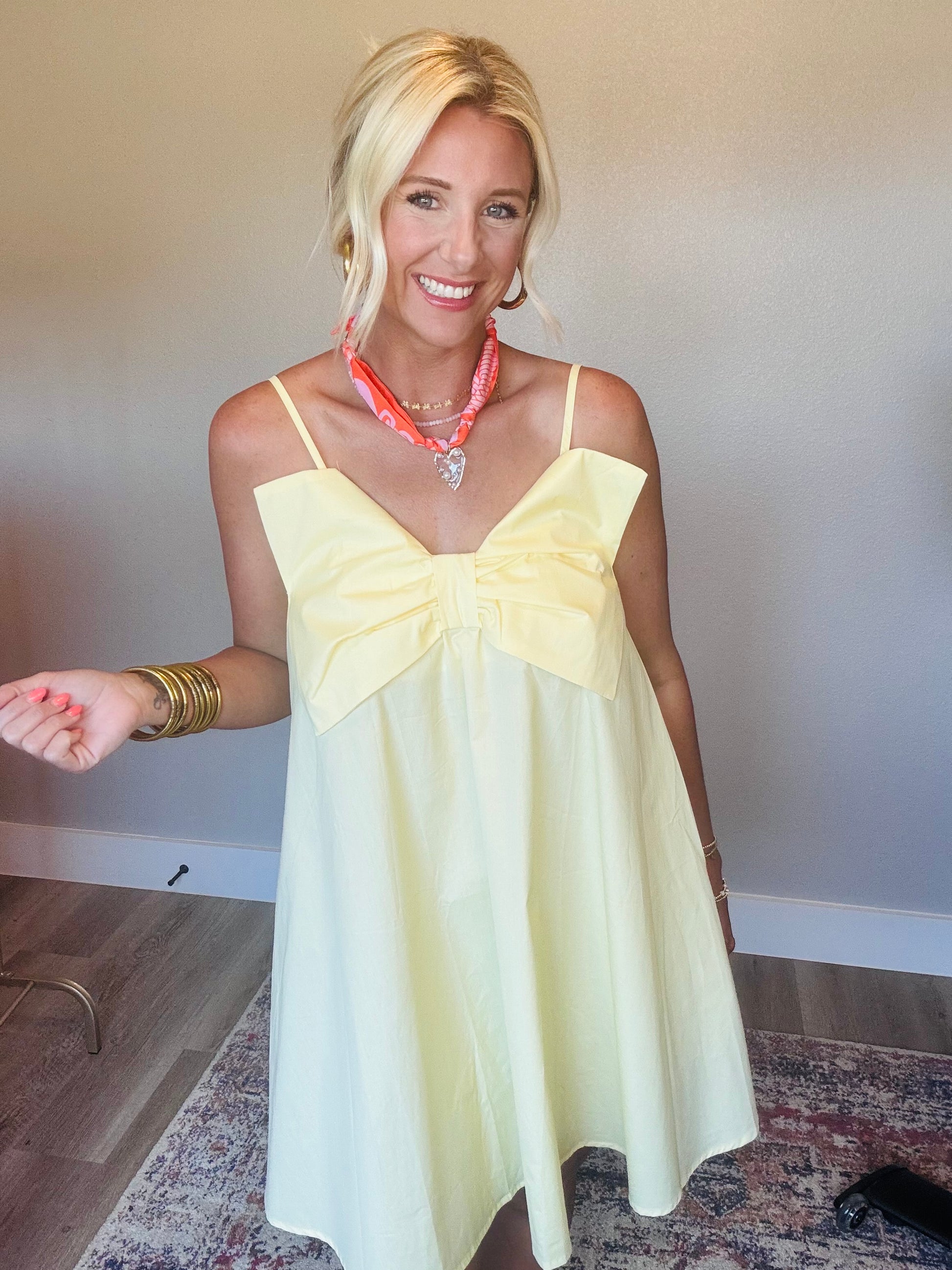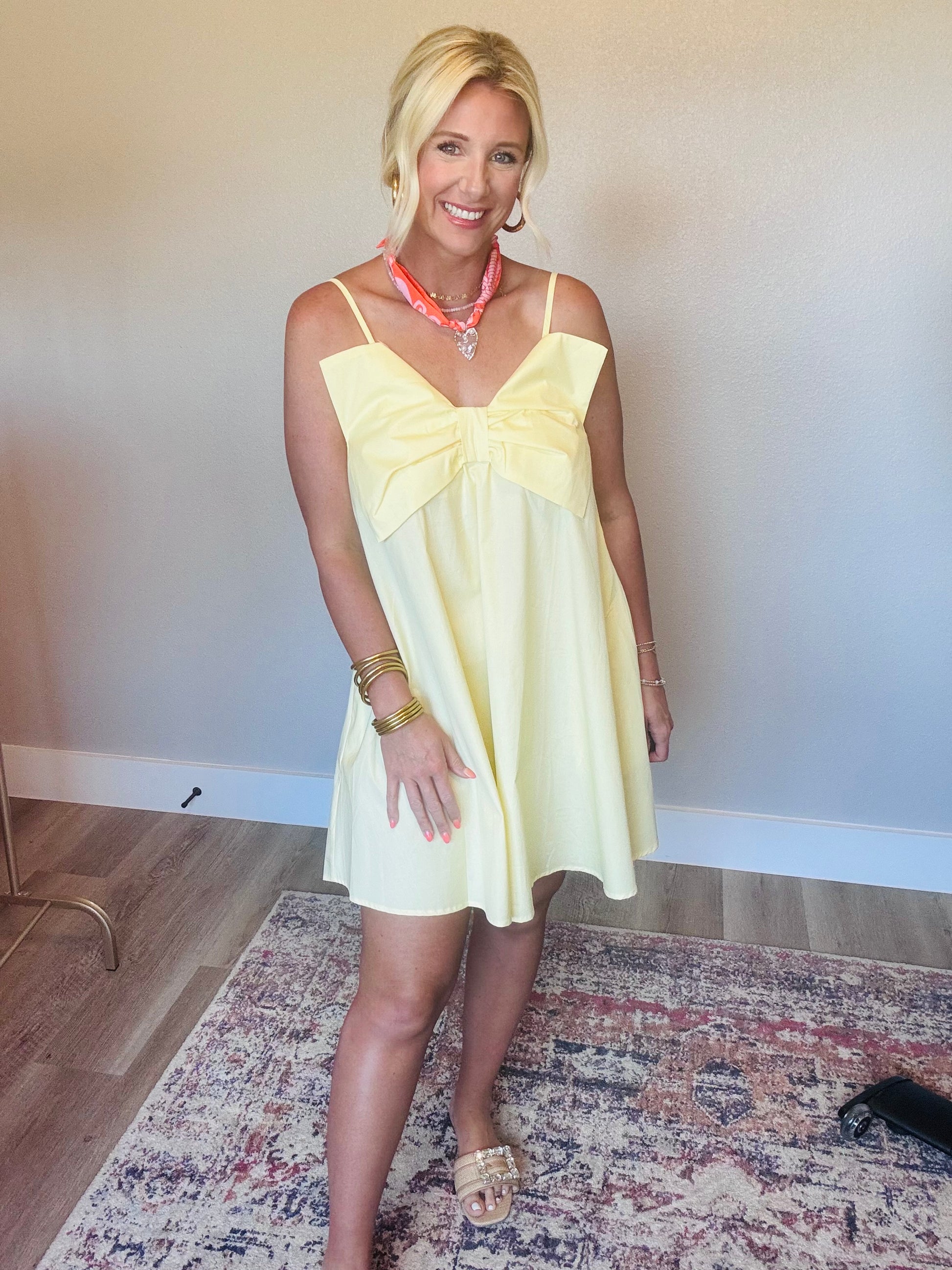 Bring the sunshine and the sass in this flirty yellow mini! ☀️💛 Featuring a statement bow detail, adjustable straps, and a breezy A-line fit, this dress is as sweet as lemonade on a summer day. Perfect for brunches, birthdays, or just feeling extra cute—this one’s made for twirls, compliments, and golden hour selfies.