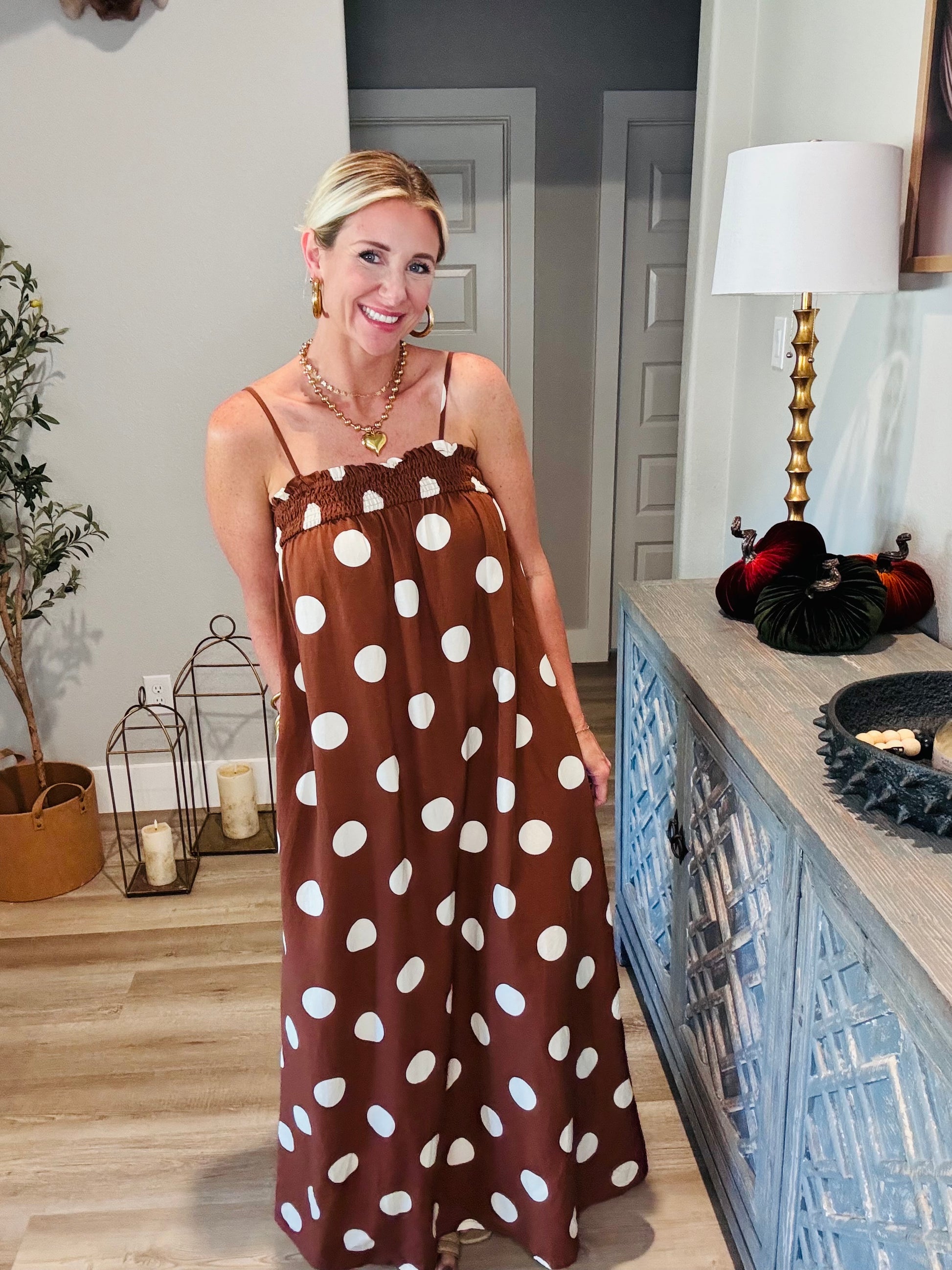 Get ready to twirl in timeless charm with this maxi! This chocolate-brown beauty features bold white polka dots for a playful yet polished look. The smocked top offers a flattering fit with adjustable spaghetti straps for comfort and versatility. Its flowy silhouette makes it the perfect pick for brunch with the girls, fall festivals, or a casual date night.