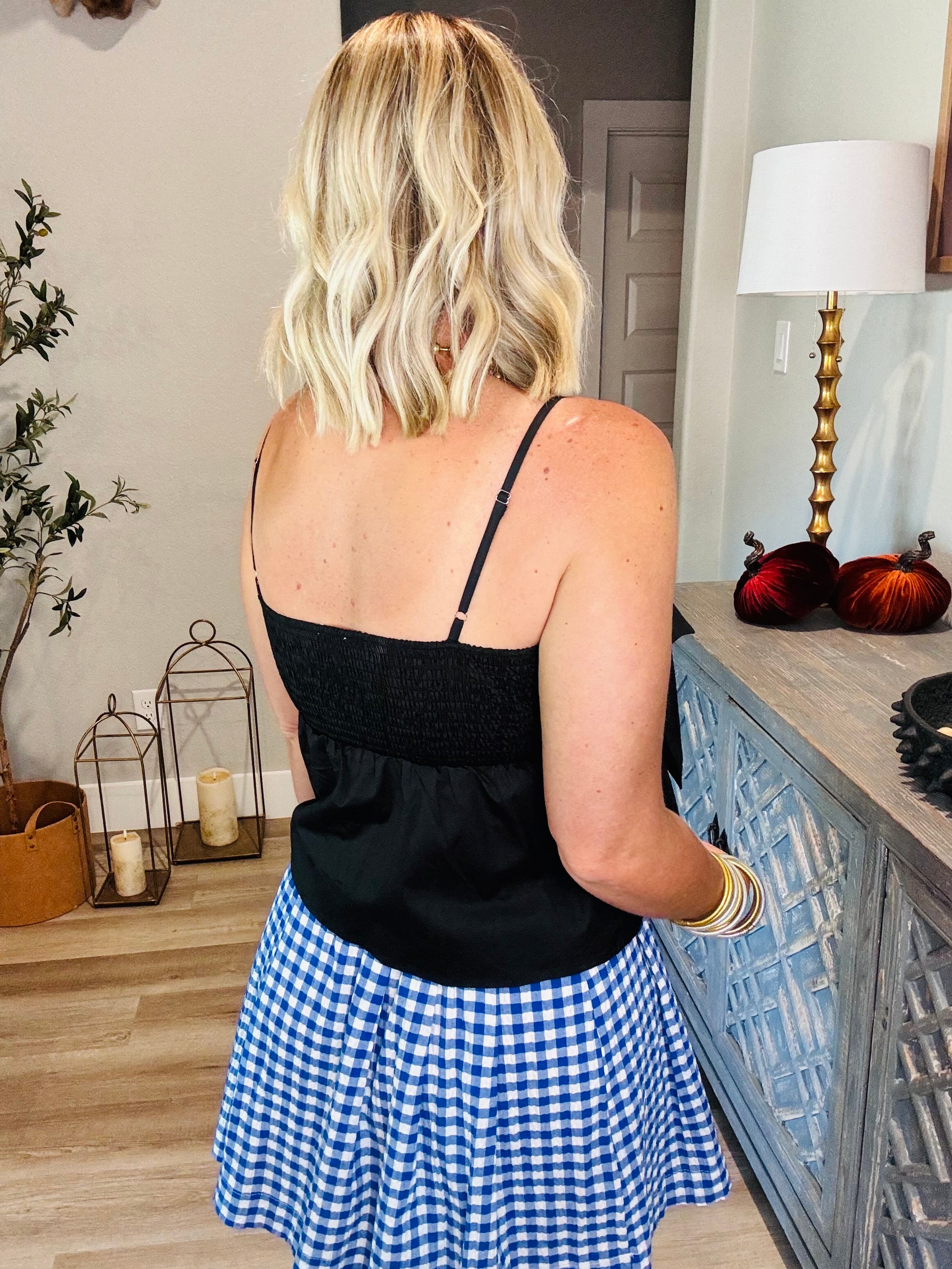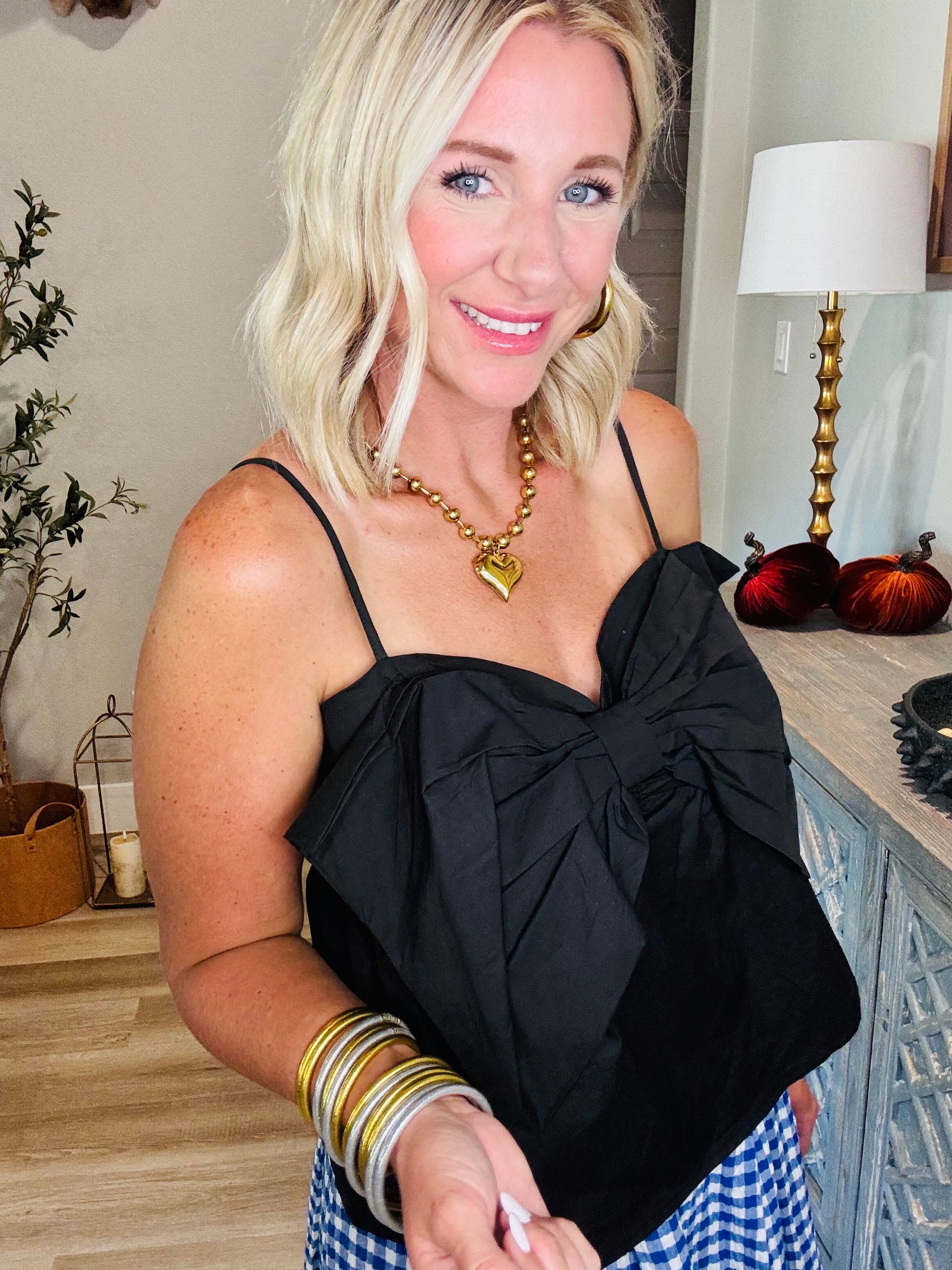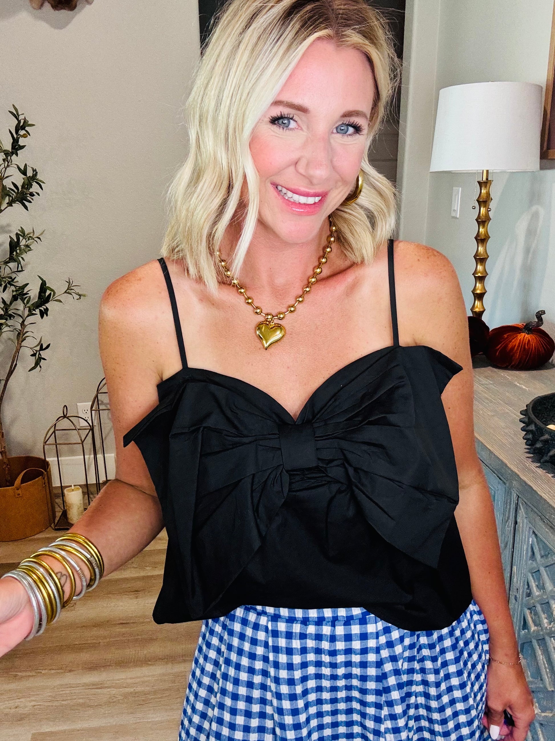 Bold and feminine, this black bow top is a total statement maker. Designed with delicate spaghetti straps and a dramatic oversized bow detail across the front, it’s the perfect mix of flirty and chic. The cropped length makes it easy to pair with high-waisted skirts, denim, or tailored pants for a look that goes from date night to girls’ night effortlessly.