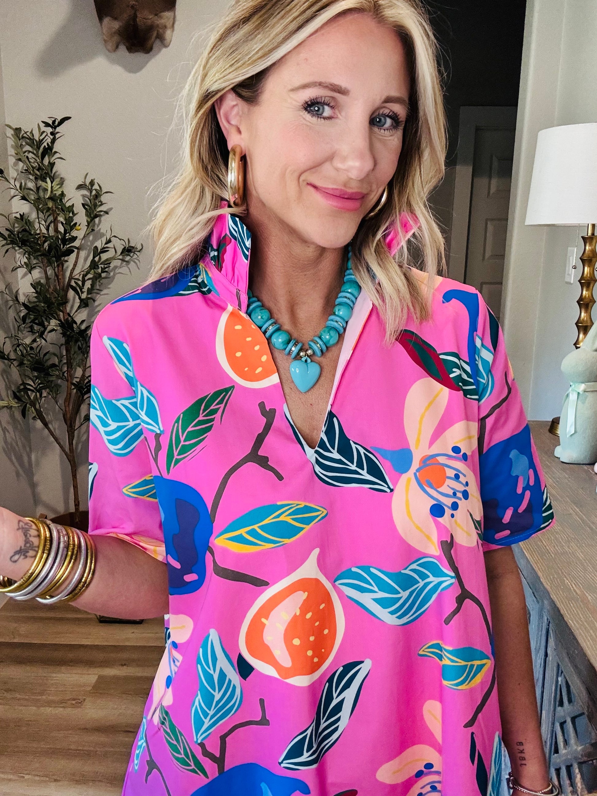 Bold, bright, and full of personality, the Sunset Bloom Dress is the ultimate statement piece for sunny days. Featuring a vibrant pink backdrop with playful floral and fruit-inspired prints in shades of blue, orange, and green, this dress instantly brings a fun, tropical feel to your wardrobe. Designed with a relaxed shift silhouette, short sleeves, and a flattering collared neckline, it’s both comfortable and effortlessly stylish. Lightweight and easy to wear, it’s perfect for brunch dates, vacations, or any day you want to add a pop of color to your look. 🌺✨