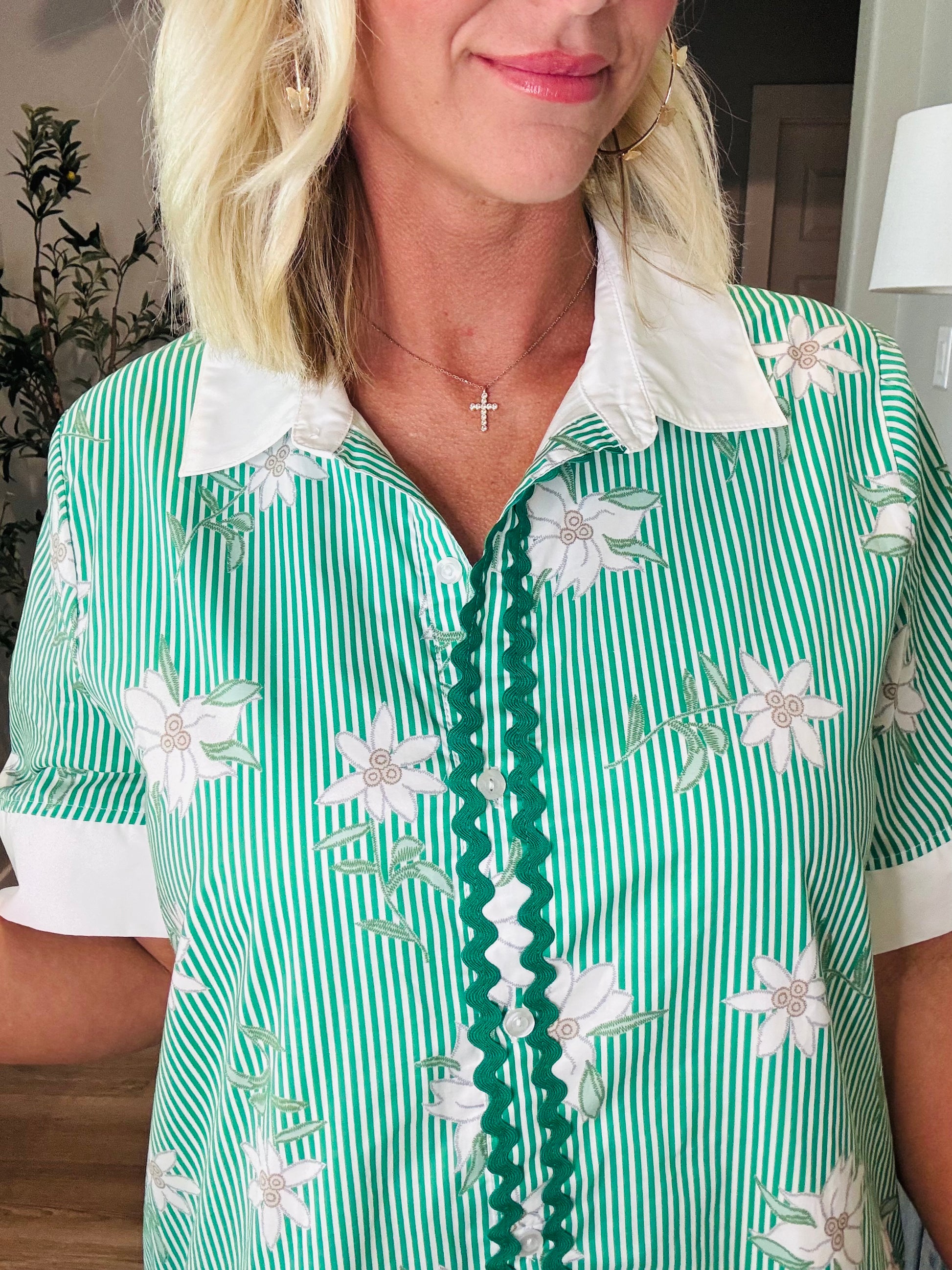 Fresh, floral, and fabulously fun! This green striped shirt dress is giving major summer charm with its crisp white collar, dainty flower embroidery, and playful ric-rac trim down the front. Easy to dress up with wedges or keep casual with sneakers—she’s the definition of effortless chic. This dress is fully lined, has functional buttons, and runs TTS